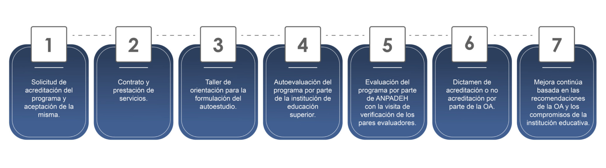 El proceso de acreditación se define por las siguientes etapa sobre la base de una solicitud voluntaria por parte de las autoridades responsables de la institución, cuyo programa académico será evaluado para su acreditación: